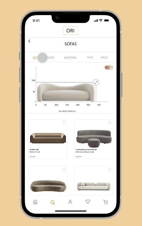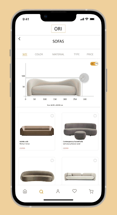 Often, size is the most difficult condition for buyers to compromise on. Instead of spending a lot of time browsing furniture that doesn't fit, helping them directly select within the appropriate size range can save them a lot of time. Additionally, using an intuitive drag-to-adjust size feature allows users to easily and visually understand their options.
